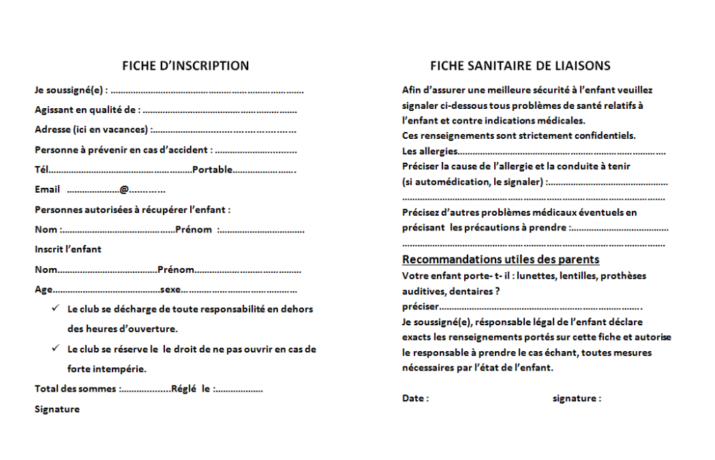 Pour valider l’inscription le jour de votre arrivée au Club, merci d’amener la fiche de liaison sanitaire remplie et signée pour chaque enfant. Vous pouvez la télécharger ci-dessous :